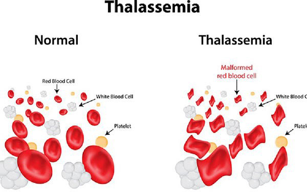 Hồng cầu dị thường (bên phải) của các bệnh nhân bị bệnh di truyền tan máu bẩm sinh thalassaemia, so với hồng cầu của người bình thường (bên trái). Bệnh này gây tan máu liên tục dẫn đến thiếu máu mãn tính.