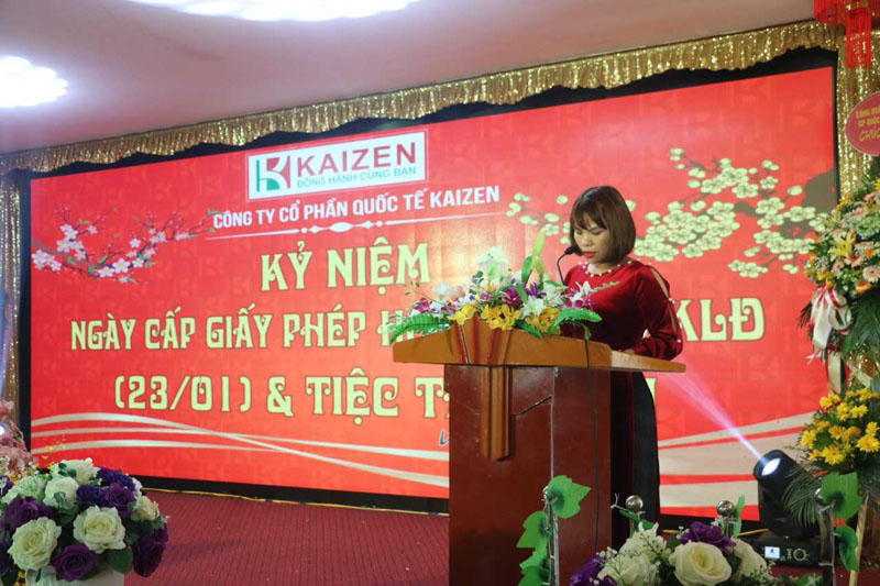 Mở đầu buổi lễ Bà Trịnh Thị Huyên - Chủ tịch HĐQT kiêm Tổng Giám đốc công ty Cổ phần Quốc tế Kaizen đứng lên phát biểu tổng kết lại 1 năm hoạt động về công tác XKLĐ, sau khi được cấp giấy phép. Đồng thời bà cũng gửi lời tri ân sâu sắc đến các ban ngành, đoàn thể đã tạo điều kiện giúp đỡ công ty hoàn thành kế hoạch năm 2018 cùng các quý khách hàng, quý cộng sự đã gắn bó, tin tưởng công ty trong những năm vừa qua.