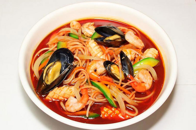 Sự kết hợp 2 nguyên liệu đặc biệt của Hàn Quốc là hải sản tươi và vị cay nồng. Đây là món ăn dành cho những người có khả năng ăn cay rất khủng và dám thử một hương vị lạ. Mì sẽ được trộn với soup hải sản rất cay, khi ăn bạn sẽ thực sự được trải nghiệm cay bỏng rát cổ họng.
