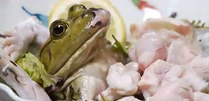 Một nhà hàng ở Nhật Bản đã gây xôn xao dư luận khi trình làng món sashimi với con ếch vẫn còn sống, ngồi chồm chỗm trên đĩa đá dù nó đã bị lột da, bỏ nội tạng. Không ít người đã tỏ ra kinh ngạc sau khi xem xong đoạn video được đăng tải trên website Stomp về món ăn có tên gọi sashimi tươi sống bởi món ăn này bao gồm cả một con ếch vẫn còn sống, ngồi chồm chỗm trên đĩa đá dù nó đã bị lột da, bỏ nội tạng.