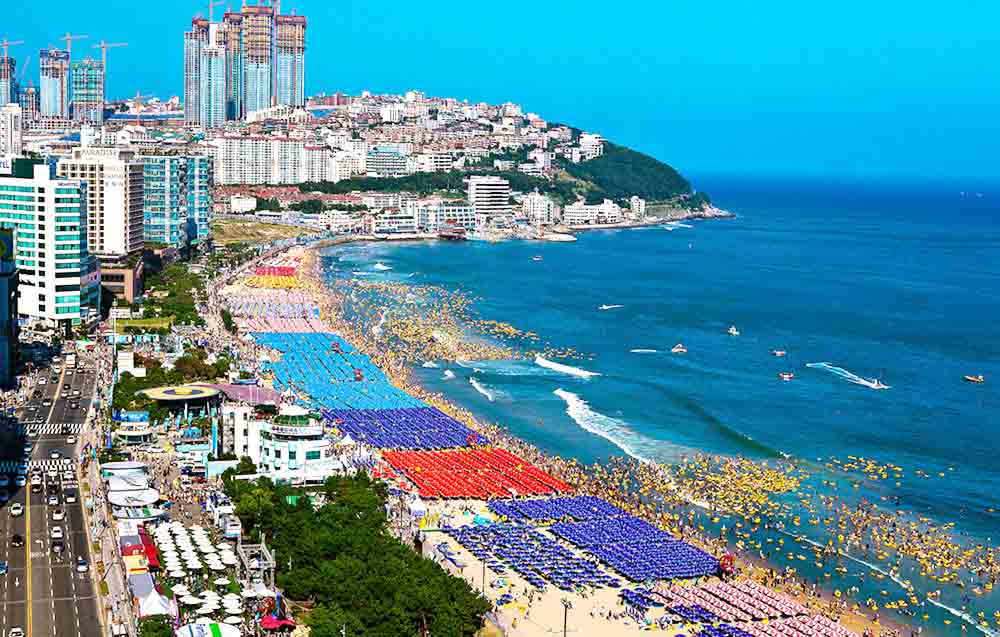 Bãi biển Haeundae giống hình dạng lưỡi liềm có chiều dài 1,5 km, rộng từ 30 - 50m với diện tích trải dài 58.400m2 và nằm trong thành phố Busan thuộc phía nam Hàn Quốc. Busan là nơi sở hữu những bãi biển đẹp với Haeundae là bãi biển nổi tiếng nhất du lịch Hàn Quốc.