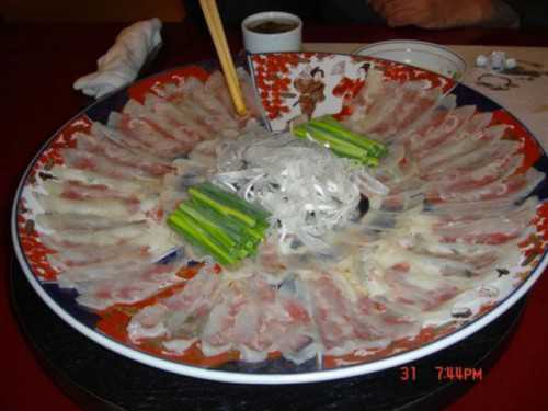 Thịt cá nóc fugu được thái mỏng và xếp trên đĩa theo kiểu nghệ thuật cắm hoa Ikebana. Fugu ăn kèm với những gia vị như nước chấm làm từ dầu mè, nước tương, wasabi, củ cải muối, giấm ponzu, chanh, ớt và phải có rượu nồng Sake hâm nóng để bớt đi vị tanh của thị cá.