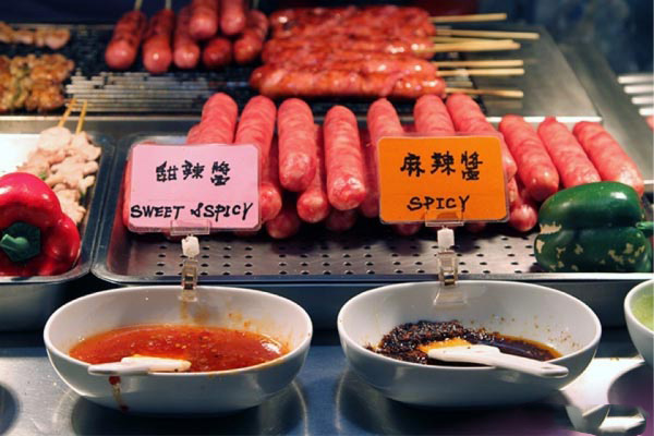 Xúc xích là món ăn đường phố nổi tiếng được nhiều du khách yêu thích. Nguyên liệu chế biến món ăn này cũng từ thịt heo, nhưng được ướp với tương đậu lên men nên khi ăn sẽ có vị ngọt.