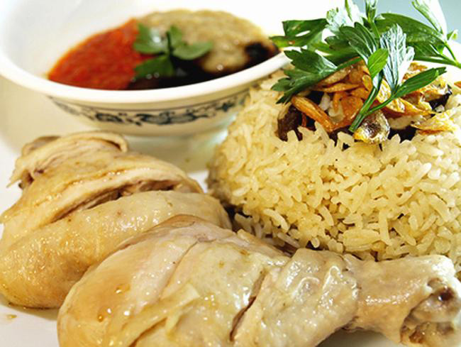 Hainanese chicken rice (cơm gà Hải nam): Món cơm gà Hải Nam là một hòn ngọc trong công thức nấu ăn được mang đến từ những người Hoa nhập cư đầu tiên có gốc từ tỉnh Hải Nam ở phía nam Trung Quốc. Món này thường được dùng kèm với một tô nước luộc gà, mấy lát dưa leo, ớt với nước tương đậm màu và một chút xốt gừng cùng một đĩa cơm gà thơm ngon.