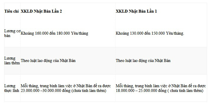 Các bạn cũng có thể tham khảo một số so sánh về mức lương đi xuất khẩu lao động Nhật Bản lần 2 so với mức lương đi xuất khẩu lao động lần 1 dưới đây: