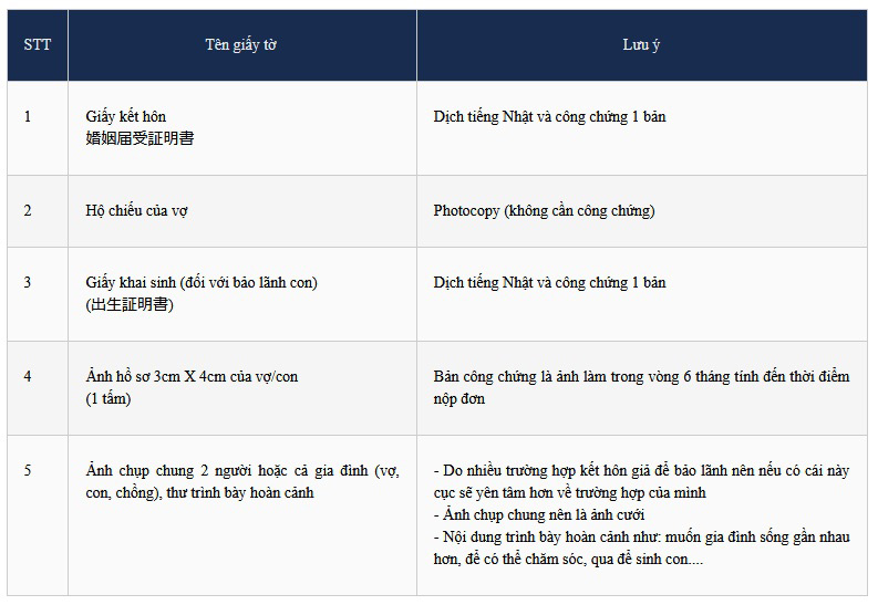 - Chứng minh được rằng bạn có đủ khả năng tài chính để cung cấp cho vợ của mình trong thời gian vợ/con lưu trú tại Nhật Bản