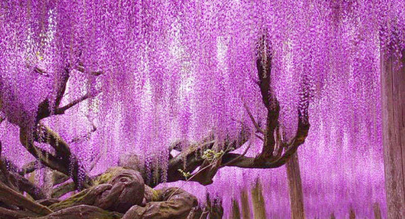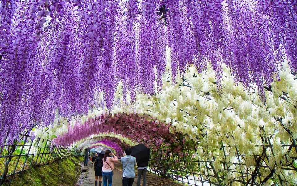 Hoa tử đằng được mệnh danh là những dòng suối hoa tím rưc rỡ nở vào giữa tháng 4 đầu tháng 5 mang lại những cảm xúc bất tận cho người chiêm ngưỡng. Cây của hoa này thuộc loại thân gỗ, nhìn khẳng khiu, khô khốc, hoa mọc thành giàn lớn, có mùi thơm nhẹ nhàng. Trên lãnh thổ nước Nhật, loài hoa này thu hút rất nhiều khách du lịch đổ về để ngắm mỗi khi tiết trời tháng 4-5. Những bông hoa màu tím rợp trời quả là một quang cảnh khó có thể bỏ qua. Chỉ nghe đến những đường hầm dài 80-100m sắc tím, sắc trắng của tử đằng thôi đã cảm thấy quá sức thơ mộng và cuốn hút rồi.