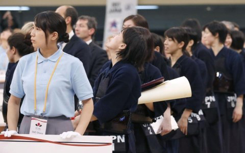 Một nữ võ sinh Nhật Bản nhìn lên trần nhà khi trận động đất diễn ra làm rung lắc tòa nhà.