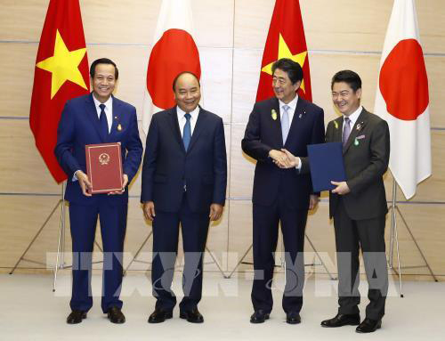 Thủ tướng Nguyễn Xuân Phúc và Thủ tướng Nhật Bản Abe Shinzo chứng kiến Lễ trao Bản ghi nhớ hợp tác giữa Bộ Lao động, Thương binh và Xã hội Việt Nam với Bộ Tư pháp, Bộ Ngoại giao, Bộ Y tế Lao động và Phúc lợi xã hội và Cơ quan Cảnh sát Nhật Bản về khung pháp lý cơ bản để thực hiện đúng Chương trình ‘Lao động kỹ năng đặc định’. Ảnh: Thống Nhất –TTXVN